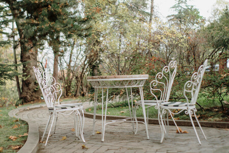 Y no hay que dejarse engañar por el término “conjunto de jardín”. Esto no es solo una mesa y cuatro sillas: es una puesta en escena de cuadro modernista. Es el tipo de mobiliario que pide ser fotografiado con una cafetera italiana en medio, un ramo improvisado, y una conversación larga sin mirar el móvil.