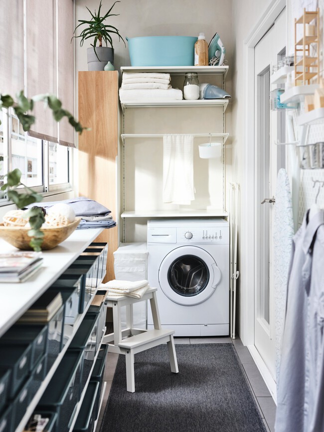 La clave del éxito del armario NYSJÖN está en su simplicidad. Su diseño compacto y funcional permite aprovechar el espacio muerto justo encima de la lavadora, un lugar que muchas veces queda desaprovechado.