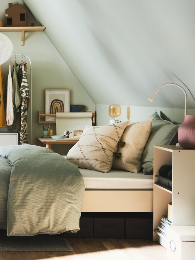 Una joya de la corona para aquellos que quieren encender la chispa en un dormitorio cálido con un color tendencia en 2025: el verde Gen Z. Lo vemos en todas sus tonalidades y productos. Desde un sillón a una mesita auxiliar, en la vajilla del comedor o en este caso, en la mesita de noche. Parece salida de una escena de película francesa, una ventana abierta, las cortinas flotando con la brisa y un libro a medio leer esperando sobre la madera.