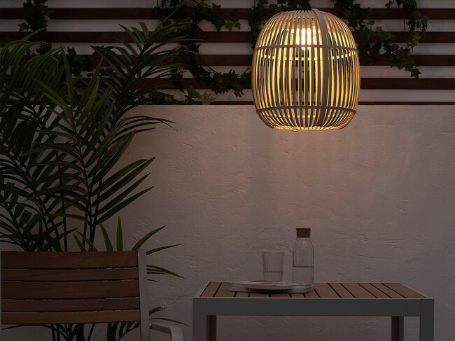 Su estructura está fabricada en ratán sintético, lo que nos garantiza que las inclemencias climáticas no le afectarán: ni la lluvia ni la luz solar (cuenta con certificado IP44). Además, también funciona si la usamos en el interior quedando ideal en el salón o en el dormitorio. No necesita mantenimiento y basta limpiarla con una bayeta húmeda para que quede impoluta.