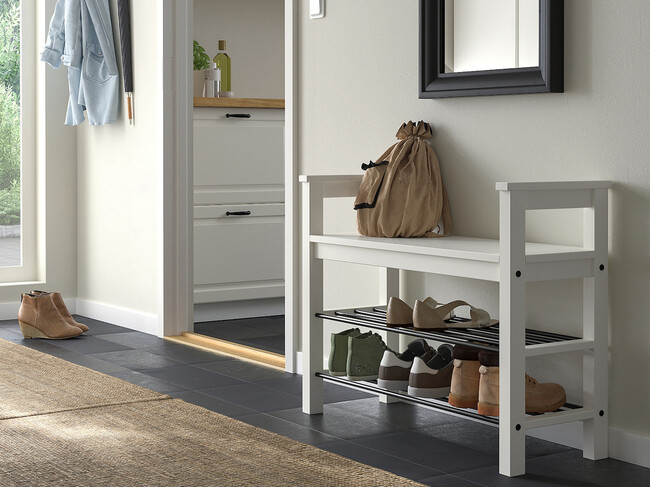 El banco zapatero Hemnes de la tienda de decoración Ikea resulta ideal para los espacios más reducidos, ya que cuenta con un diseño fácil de encajar en cualquier rincón y además de ofrecernos espacio de almacenaje para nuestro calzado también nos permitirá calzarnos o descalzarnos con comodidad al entrar y salir de casa.