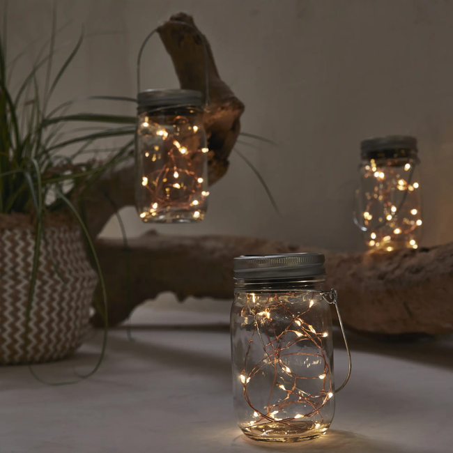 Un pack de tres tarros solares LED fabricados en cristal transparente y muy decorativos para iluminar la terraza en primavera sin necesidad de toma de corriente eléctrica. Colgados en cualquier superficie de la pared o posados sobre la mesa de comedor, estos tarritos dan un toque muy personal y original a las zonas exteriores del hogar.