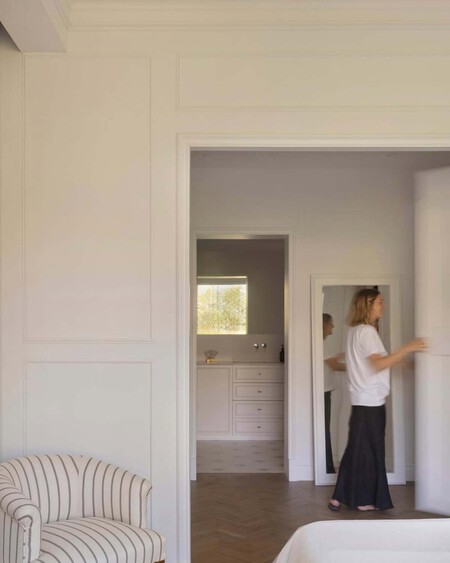 En este dormitorio, Andrea ha apostado por molduras finas y rectas, enmarcando zonas estratégicas de la pared para crear un efecto panelado o enmarcado, que añade profundidad y sofisticación sin restar serenidad. Pintadas del mismo tono que la pared (un blanco cálido, luminoso y atemporal), el resultado es una textura visual que eleva por completo el espacio sin gritar por atención.