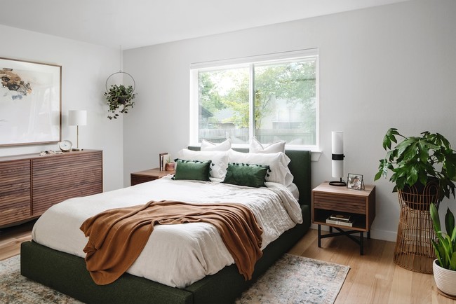 Hay otros detalles interesantes, por ejemplo los complementos textiles, en particular la ropa de cama es de West Elm, aunque el edredón es sencillo y en lino natural para ceder más protagonismo a otros elementos del dormitorio. Los cojines decorativos los podemos encontrar parecidos también en Amazon en un tono así verde oscuro 18,99 euros.