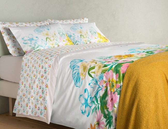 - Juego de funda nórdica, confeccionada en 100% algodón con un diseño lleno de flores que se inspira en un cuadro pintado con acuarelas. Antes, costaba