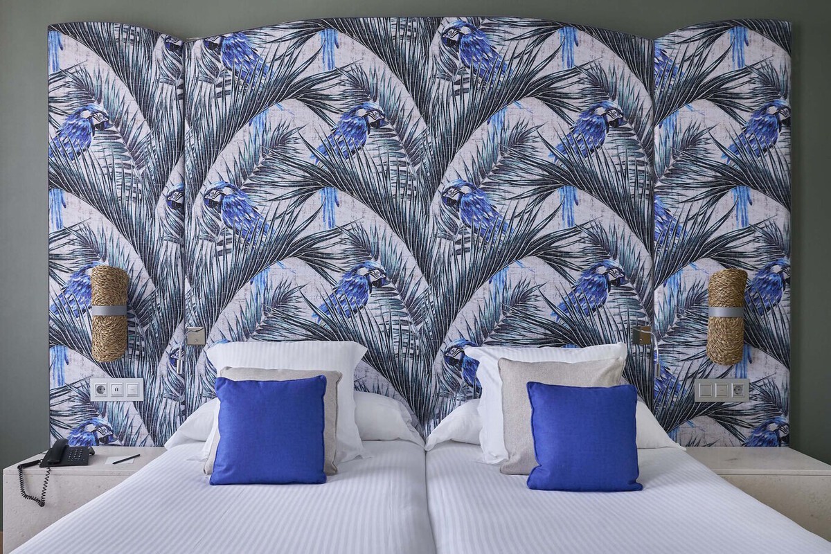 Aquí entramos en el terreno decorativo pero rara es la habitación de hotel que no cuenta con un cabecero y si no lo tiene es porque algo pasa en esa pared. Un zócalo alto, un diseño especial con papel pintado..., en definitiva algo que haga destacar la pared del cabecero.