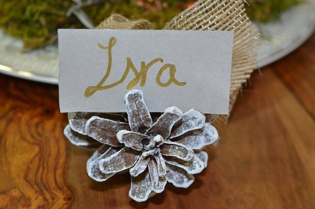 Otra versión de marcasitios con ramitas de pino: coge una rama, dóblala para hacer una minicorona, átala, y pon encima el cartelito con el nombre de tus invitados.