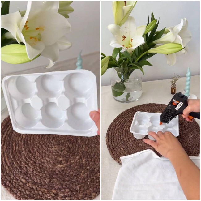 Solo necesitas este plástico vacío y un retal de una tela o sábana vieja. Comienza a forrar todo el plástico con esta tela y asegúrate de que queda bien sellado con una pistola de silicona. Ve pegando la tela amoldada a los agujeritos y consigue un resultado realista.