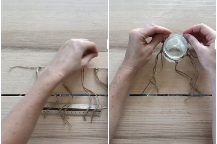 Un poco de cuerda de yute, pegamento resistente y mucha paciencia. Así se construyeron las asas y las redes colgantes que permiten suspender los botes de yogur reciclados en ramas, ganchos o estructuras. El resultado es cálido, funcional y profundamente decorativo.