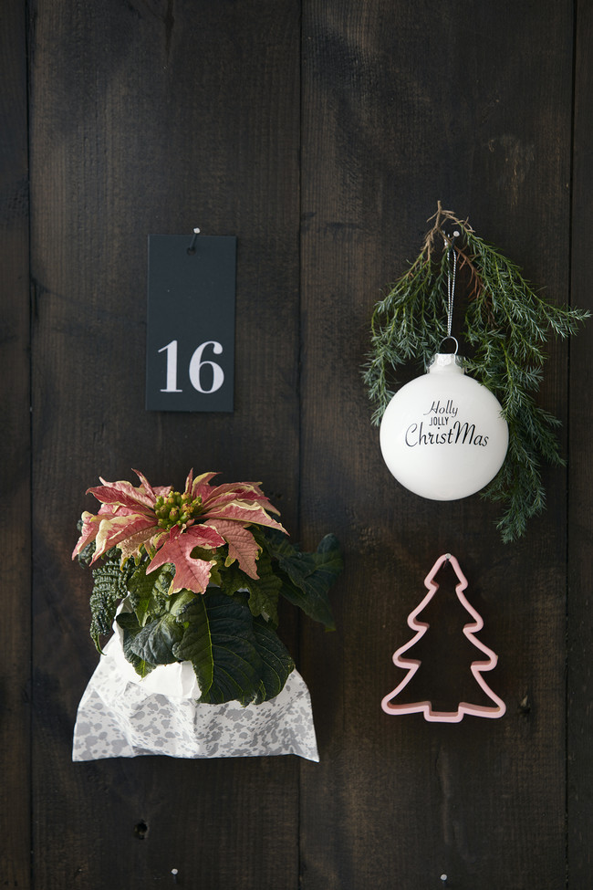 Si tenéis problemas de espacio y lo de usar un gran trozo de pared para el calendario de adviento no os convence, tenéis la opción de colgar un paquete por día de una misma maceta. En la imagen sobre estas líneas tenéis un buen ejemplo. Una gran maceta de fibras vegetales, con una hermosa poinsettia en su interior es un buen punto de partida para el proyecto.