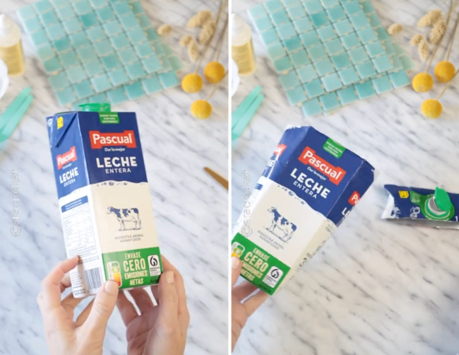 Hoy os traemos un proyecto DIY fácil y resultón para reutilizar un brik de leche y transformarlo en un jarrón que parece sacado de una tienda de diseño y que es ideal para elevar el nivel deco de tu casa de forma sencilla gracias a los azulejos de gresite. Esa idea, la hemos visto en la cuenta de TikTok de @sracricket.