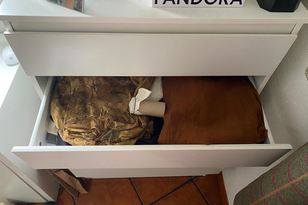Para cerrar el difusor, se repite el proceso en el otro extremo del tubo, asegurando la tela con otra goma elástica. El resultado es un pequeño cilindro aromático, ligero y completamente reutilizable, listo para colocarse en el fondo de un cajón, entre la ropa doblada o colgado dentro del armario.