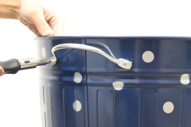 Antes de empezar a pintar además de retirar la tapa es conveniente, si es posible, quitar también las asas de la cesta, quedarán muy bien si las colocamos en su color original después de terminar de pintar el resto.
