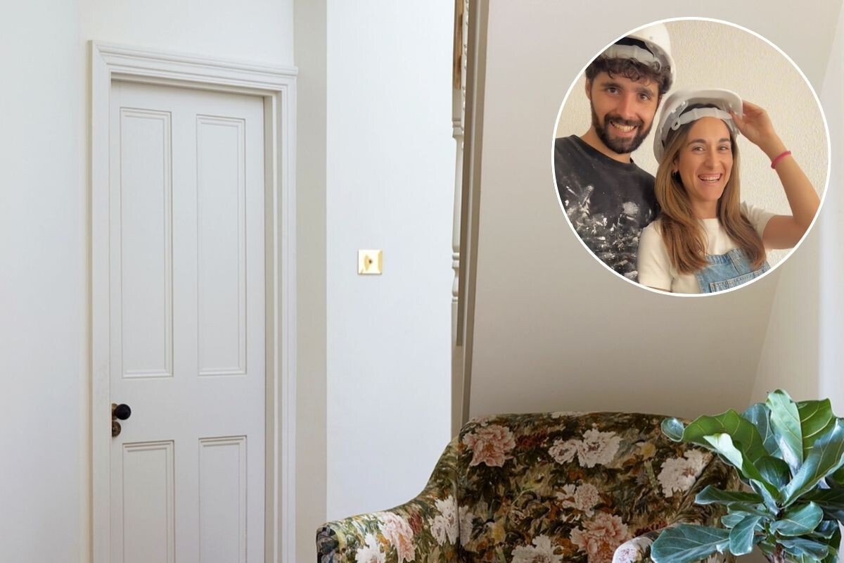 Lo primero que hicieron Hugo y Raquel fue retirar las puertas de sus bisagras, una estrategia clave para trabajar con comodidad y evitar que estas partes metálicas se pinten accidentalmente. Además, aprovecharon para cambiar los tradicionales pomos rotativos —muy extendidos en la mayoría de viviendas españolas— por una opción mucho más actual: unas estilizadas manetas doradas.
