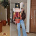 En el gorro, pinta algún detalle decorativo en dorado, igual que en la hebilla del cinturón. También puedes añadir una franja negra y toques dorados en las mangas para simular hombreras y complementos metálicos, siguiendo el estilo del cascanueces tradicional. Para rematar, ata en el cuello una tela o pañuelo rojo, que aportará un toque más cálido y navideño. Y ya está: un cascanueces handmade, grande, decorativo y hecho casi por completo con materiales reciclados.