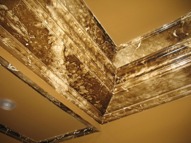 Cuando los cristales y las vetas estén totalmente secos se debe aplicar una capa de barniz. Cuando este se seque aplique otra capa pero de barniz abrillantador. Por último, aplica** una capa o dos de poliuretano** para así garantizar la resistencia y la durabilidad de la obra. Mientras vayas realizando el marmolizado debes parar varias veces para observar desde diferentes distancias como va quedando el acabado, así podrás rectificar con ayuda de un paño con aguarrás o disolvente.