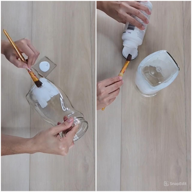 Con la tapadera, lo mismo. Primero, abre un agujero en la parte superior con unas tijeras o un clavo caliente hasta conseguir las dimensiones de tu dispensador. Pinta la tapadera con la pintura acrílica del color que más te guste y cuando se seque, barnízala para intensificar el resultado. pega el dispensado a la tapadera con silicona y ya lo tienes. ¡Mira que jabonera más bonita!