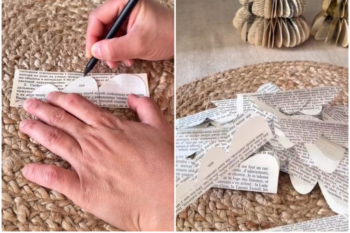 Primero, dobla una hoja de periódico o de un libro viejo por la mitad y dibuja la silueta de medio árbol de Navidad, desde la base hasta la punta. A continuación, recorta la forma y utilízala como plantilla para repetir la misma figura varias veces.