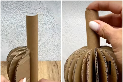 El proceso es más fácil de lo que parece. Primero, corta varios semióvalos de cartón, del tamaño que desees, y pégalos alrededor del tubo de papel de cocina con silicona caliente. Este detalle inicial crea un patrón que aportará textura y volumen al jarrón, pero es importante no cubrir el extremo superior del tubo; dejarlo libre permitirá que el jarrón tenga una boquilla definida.