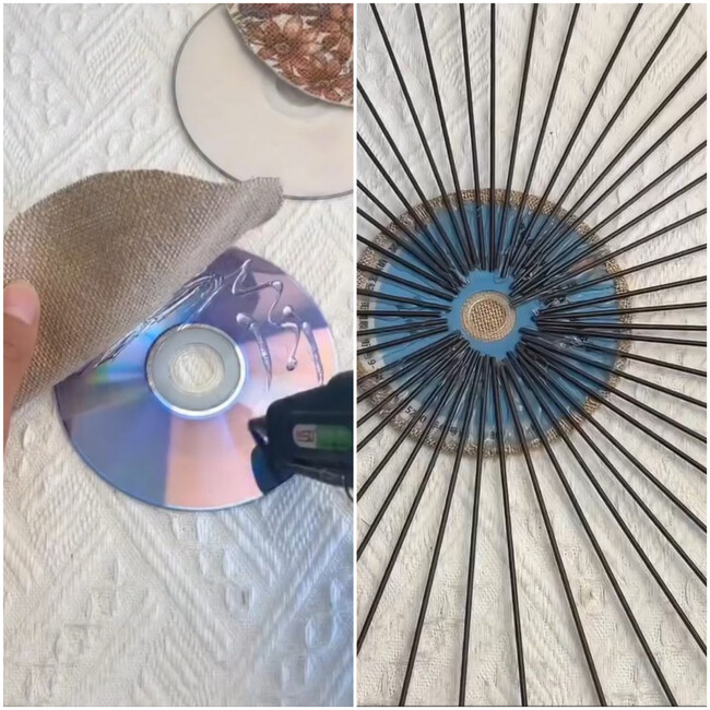 Para empezar, se forra la llamada “cara bonita” del CD con un trozo de tela al gusto. Puede ser lino, algodón o cualquier tejido que armonice con la decoración de la casa. La tela se fija cuidadosamente con silicona caliente, asegurando que quede bien tensada y sin arrugas.