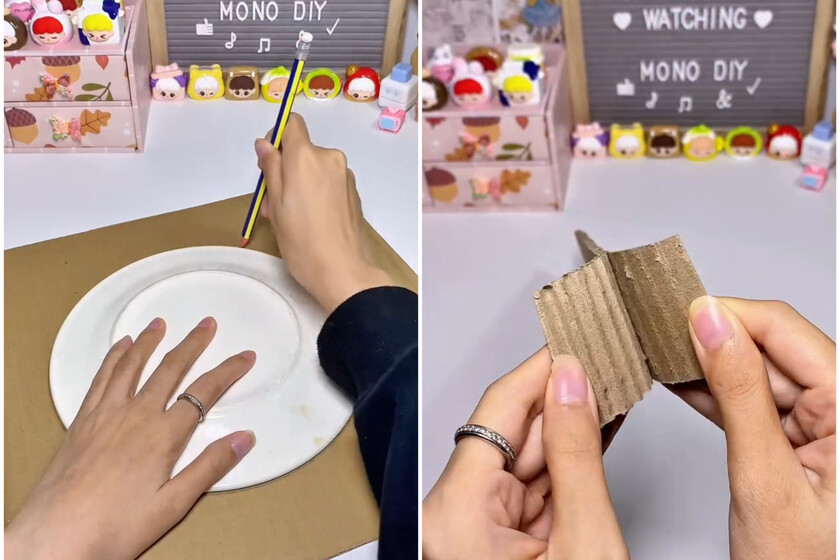 El proceso comienza dibujando una circunferencia sobre el cartón, utilizando como guía cualquier objeto redondo, como una lata. Una vez recortado el círculo, se divide en dos mitades, que serán la base de cada pequeño cajón.
