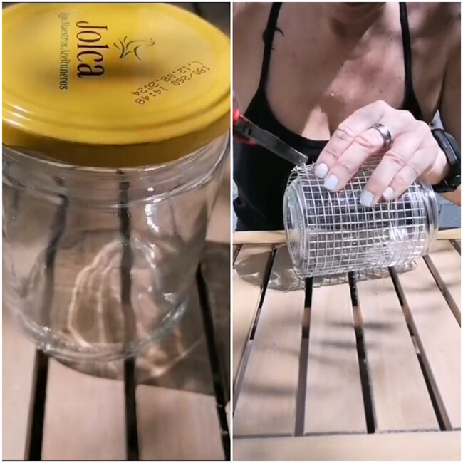 Primero, recorta un trozo de malla de alambre que se ajuste al ancho de tu tarrito y ajústalo con unos alicates alrededor del diámetro del tarro de cristal. Cuando lo tengas, coge la tapadera y recorta dos circunferencias de cartón de las mismas medidas las cuales pegarás sobre la tapadera.