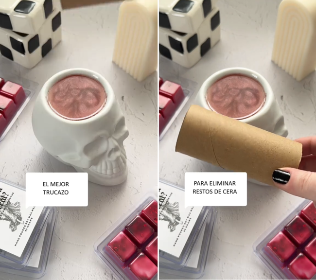 La idea la hemos visto en la cuenta de TiktTok de @whisperinwax. Y nos ha parecido fantástica para retirar la cera de esas velas que vienen en frascos bonitos o en recipientes que podemos reutilizar como elementos decorativos, y que en ocasiones, se queda dura tras el último uso y aunque la vuelvas a encender, la mecha ya no prende.