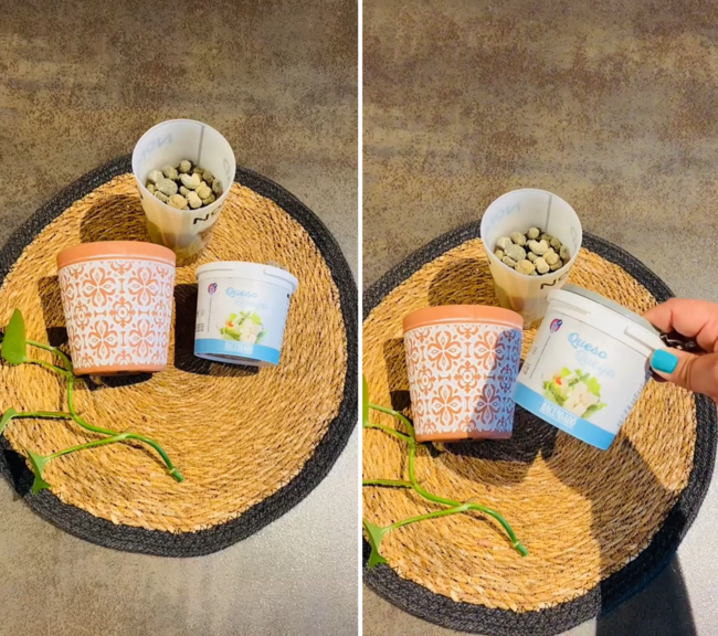 Después, tan solo hace falta meter el envase del queso en el interior de la maceta. Y tendrás una maceta de hidroponía de una forma sencilla y rápida.
