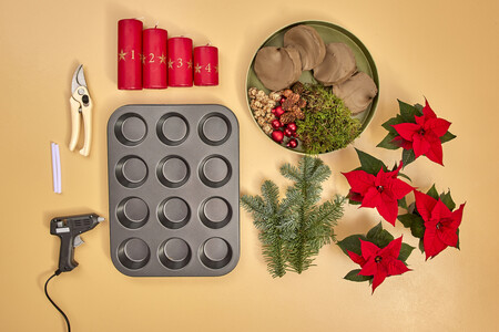 Para esta manualidad navideña reciclada, necesitaremos un viejo molde para magdalenas de doce huecos, arcilla, una pistola de pegamento caliente con sus barras, cuatro velas rojas de diferentes alturas, cuatro mini flores de Pascua rojas, tijeras de podar, musgo, pino verde, piñas y otros adornos navideños pequeños. Tal vez también necesitemos alambres de florista para sujetar algunos de los adornos.