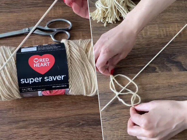 Por eso, primero corta la lana en múltiples segmentos y dóblalos por la mitad. Esta será la base de cada fleco. Ahora, apoya la aguja o el palo firmemente sobre una superficie plana y toma dos tiras dobladas y entrelázalas: pasa una por debajo de la aguja y otra por encima. Tira suavemente para que ambas queden firmemente anudadas alrededor de la base.