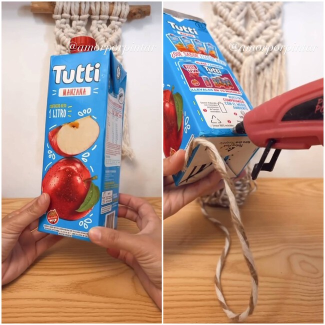 En este contexto, Romina Guerra (@rominaguerra.deco), ha elaborado sus propios organizadores partiendo de la base de un cartón de zumo reutilizado. Es tan fácil como hacerle un corte en la parte de arriba (la zona del tapón) y empezar a trabajar sobre ello.