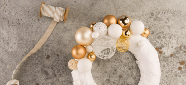 Una corona de porexpan, bolas de Navidad en diferentes tamaños (mínimo tres), unas tijeras, pegamento secado rápido (textura siliconada), cintas de color, papel de seda.