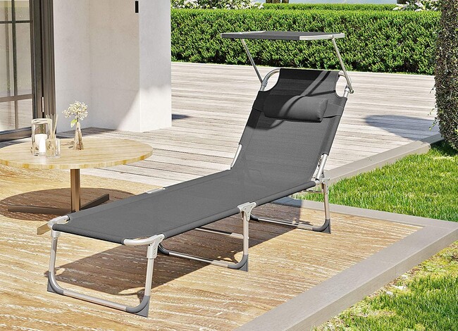 En Amazon también hemos encontrado esta tumbona con un diseño moderno y diferente. Es plegable, reclinable, y cuenta con reposacabezas y respaldo ajustable en 5 niveles, y su tela, es transpirable. Cuesta 45,99 euros.