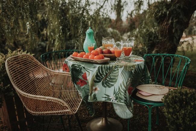 Si no lo ves claro, otra posible opción es sacar al exterior una mesa de ayuda y encontrar la sintonía con el ambiente, queda más bonita si tiene otro tamaño distinto al de la mesa principal, bien mayor o menor, según las necesidades. Todo está basado en un diseño imaginativo donde puedes mezclar las tendencias con tus gustos personales.