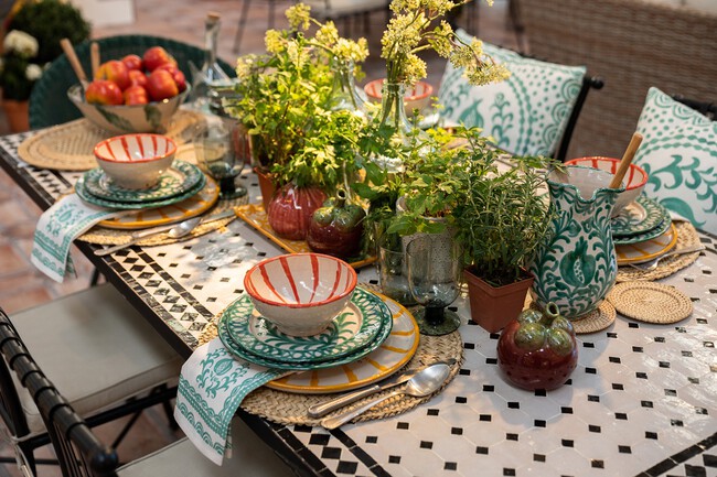 Para llenar nuestros exteriores de color y artesanía de aires sureños. El Corte Inglés propone diseños campestres y cerámica pintada a mano, en tonos verdes y amarillos tanto en el menaje de mesa, como en los textiles.