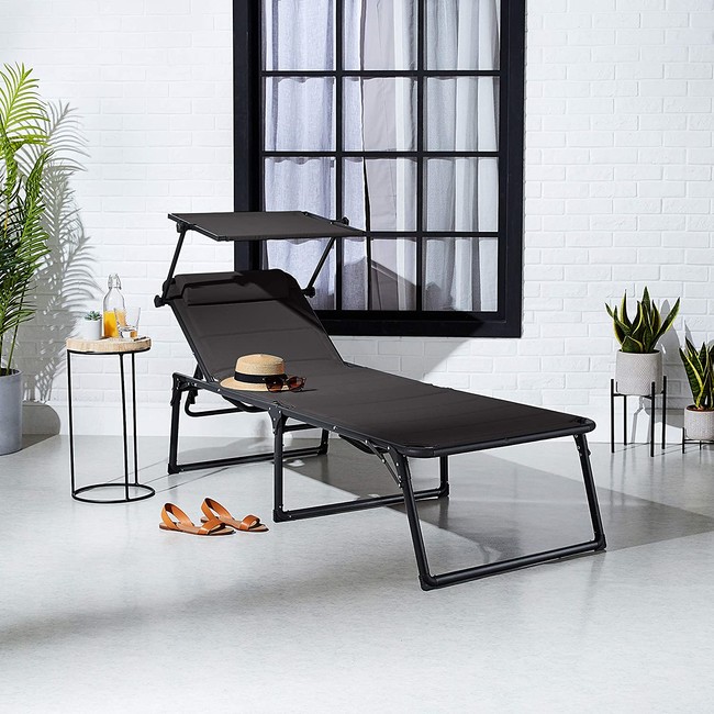 - Amazon. Tumbona de aluminio plegable de tres patas con toldo, acolchado de secado rápido. Cuesta 99,99 euros.