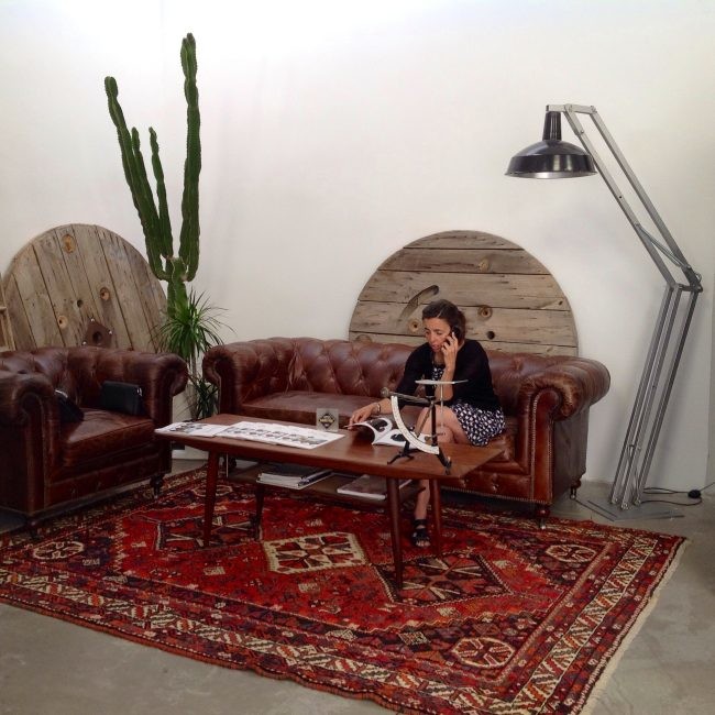 Dentro del loft se ha habilitado una pequeña oficina dentro de un contenedor, los espacios están separados por un muro de equipos de música y altavoces enormes desfasados, allí estuve con Jorge de Men's Health, identificando los que reconocíamos de nuestra infancia y juventud. Los suelos de cemento abrigados con alfombras de lana y los chester dando el toque clásico.