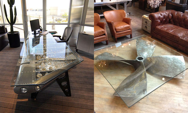 Para dicho efecto, el estilo industrial se ha interesado en antiguas máquinas industriales para usar sus piezas en la fabricación de muebles específicos. ¿Pero qué tal y en lugar de maquinaria de fábricas usáramos partes de avión? Tal ha sido la dinámica de varios creadores que han lanzado una tendencia interesante al crear muebles usando como materia prima nada más ni nada menos que verdaderas partes de aviones viejos. Así vemos motores transformados en sillones, alas que son hermosos escritorios entre muchas otras atractivas cosas.