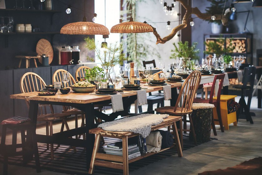El secreto: combinar los frentes negros con madera natural, lámparas de fibra y vajilla blanca. SKOGSTA Mesa de comedor, acacia/negro, 449€ e INGOLF Silla, negro-marrón 55€ serán el complemento ideal para las reuniones, bajo la cálida luz de SINNERLIG Lámpara de techo, bambú/a mano, 49,99€.