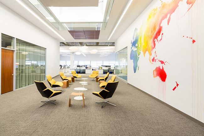 Una de las cosas que más sorprende en estas oficinas es la presencia masiva de luz que se logra a través de espacios abiertos con grandes ventanales y mucho color blanco. Para contrastar con esto los diseñadores adoptaron un mobiliario muy colorido así como una decoración basada en obras de arte igualmente de mucho color.