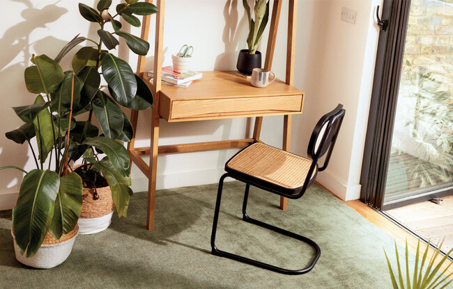 En la imagen superior Ben Gilbert, jefe de producción de Made.com, ha aprovechado un hueco muy luminoso junto a una puerta acristalada para instalar una estantería con escritorio de madera roble francés. Se trata del modelo Wingrove (679 euros). Para el trabajo usa la silla Leora (189 euros) (inspirada en la mítica silla Cesca) y completa el espacio con muchas plantas lo que hace muy agradable el resultado final.