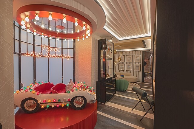 El coche de carrusel está coronado por un techo circular rojo con bombillas, y detrás, tiene el espectacular neón iluminado con la frase “Never Stop Dreaming”, que refuerza el mensaje con el que el proyecto quiere impactar al visitante “nunca hay que dejar de soñar”.
