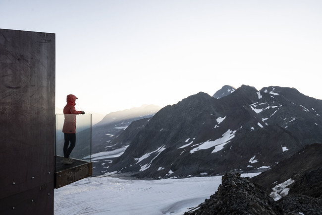 En este complicado paraje de los alpes italianos (al otro lado de la cima se encuentra Austria) el estudio de *Noa arquitectura ha levantado esta plataforma de observación panorámica a tan solo 50 metros de la cima. Muy cerca de esta plataforma se encuentra el Hotel Grawand, -uno de los pocos hoteles de Europa levantado a más de 3000 metros sobre el nivel del mar-, esta plataforma es parada obligatoria para todos los montañeros y los esquiadores que quiere acceder a la cumbre de la montaña. La plataforma, elevada sobre la nada, te permite experimentar la naturaleza en su máxima expresión: accidentada, pedregosa, ventosa y de clima extremo.