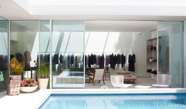 Y desde luego que uno no se espera ir de compras y encontrarse con un pequeño paraíso organizado en torno a una piscina de agua azul brillante, con enormes ventanales de suelo a techo que hace que se confunda el límite entre el interior y el exterior y que la luz inunde todas las estancias.