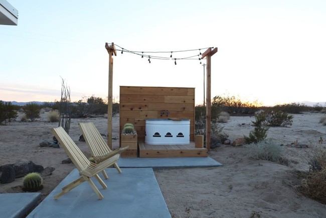 En la original cabaña han sabido crear y decorar un baño al completo, además de sacar una bañera al exterior, imagino un baño en ella en pleno silencio desértico. La cocina se reviste de tonos naturales al igual que el dormitorio, que evoca un estilo Boho chic muy actual e ideal por su colorido para conjuntar con el entorno.