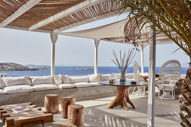 Ubicado en un edificio blanco, con paredes encaladas, típico de la arquitectura de Mykonos, consta de sólo 20 suites increiblemente elegantes. Dentro de un estilo natural se ha creado una fusión de lujo entre lo bohemio y moderno. La mezcla en el diseño se combina coon una iluminación retro, sillas Acapulco, ventiladores grandes y modernos que aparentan ser molinos de vientos y que es un reflejo de los molinos de los que la isla presume.