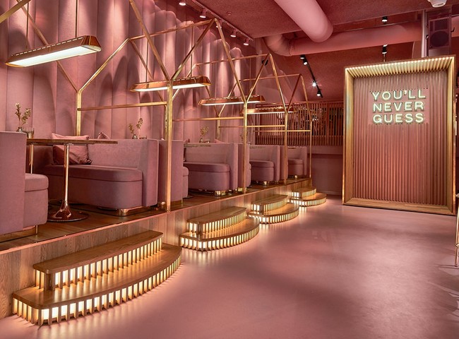 Los detalles diferentes y exclusivos son, el dorado junto con madera beteada, las proyecciones de luz que iluminan letreros reflexivos o los escalones para acceder a los reservados con forma de casitas individuales.