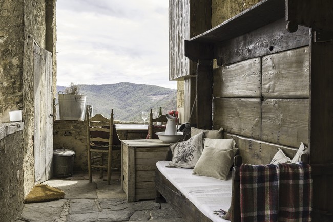 El primer impacto que recibe el huésped al llegar es el de encontrarse en el patio abierto con maravillosas vistas a la montaña frente a un precioso chill out bajo el porche porticado de piedra que ha sido creado con una cama antigua y decenas de cojines, velas y plantas. A continuación, atravesar las antiguas cuadras se convierte en toda una experiencia, dado que Eva las ha decorado con exquisitos bodegones que incluyen cestos, productos de las huertas vecinas y decenas de velas y candelabros. En el primer piso es donde está el otro porche cubierto con vistas sobre la inmensidad del valle que antecede a la cocina donde, frente a la chimenea encendida, los huéspedes hacen el checkin con una invitación a degustar una cerveza o un vermut artesanales elaborados en la misma comarca del Ripollés.