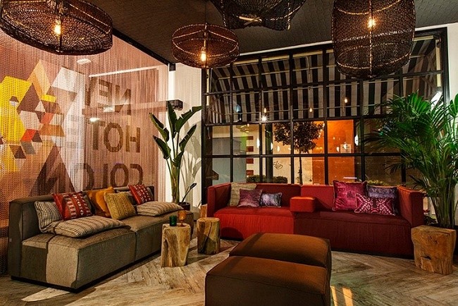 En la recepción, llaman la atención una tremenda y glamourosa cortina metálica en color rosa con el hombre del hotel en color cobre y que sirve de separación entre el hall y la zona de relax que se esconde detrás.