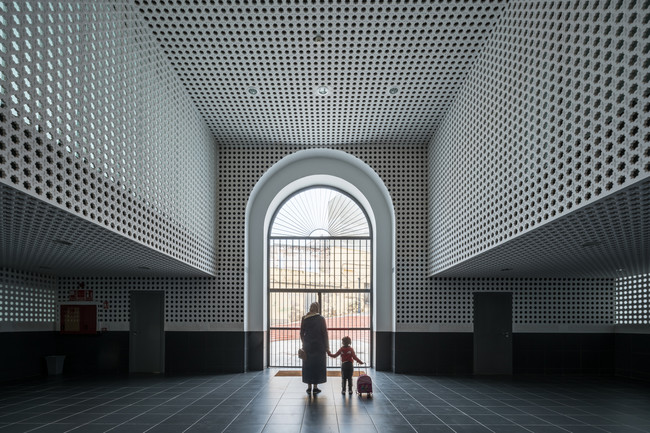 Hay una clara reinterpretación de los materiales y geometrías locales. Así, unas piezas de artesonado encontradas al otro lado de la frontera, en Marruecos, se trasladaron al edificio reconvertidas en yeso. Lo mismo ocurrió con las piezas de piedra en el suelo con la letra “M” escrita en los alfabetos de las cuatro culturas que pueblan la ciudad que se convirtieron también en yeso y "se incorporaron en un gesto de arquitectura parlante a los vestíbulos como lugares sociales de encuentro"" como señalan desde el estudio.